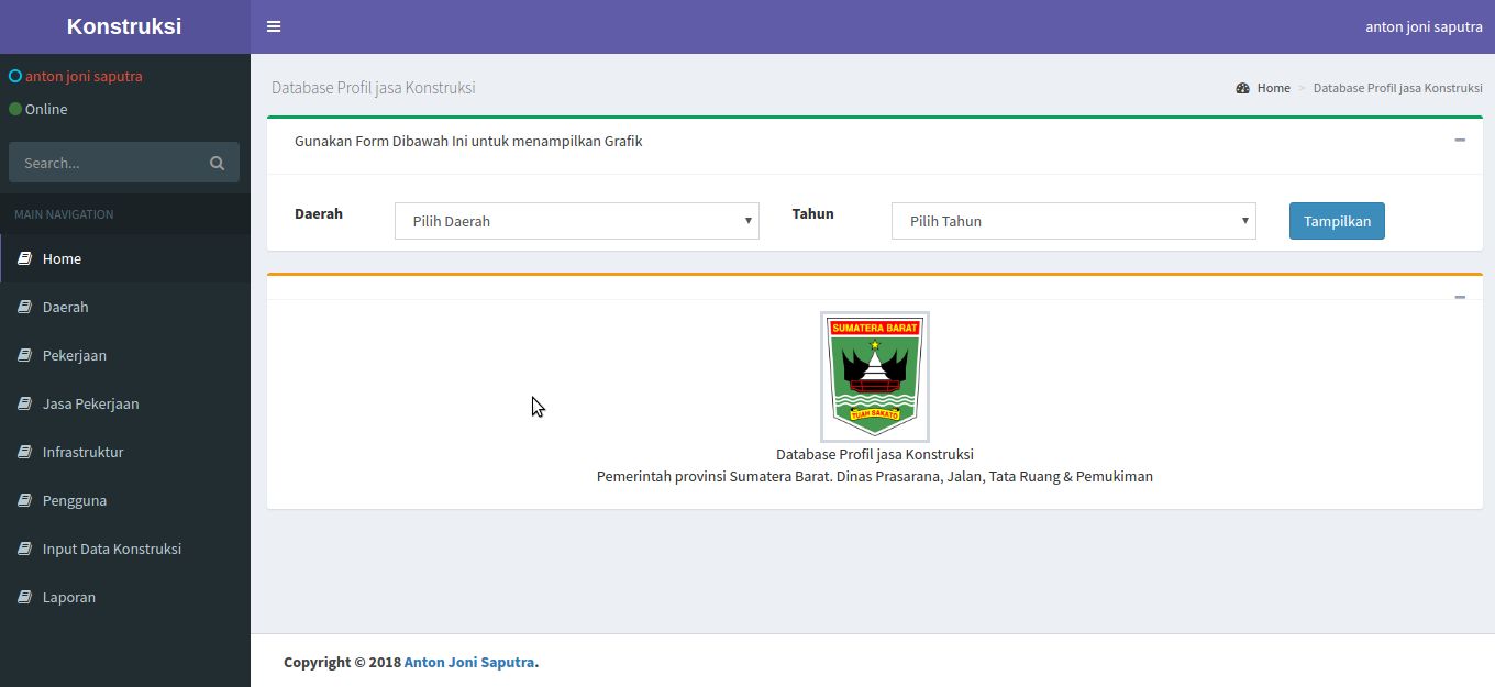 setelah berhasil login halaman pertama yang bisa dilihat adalah halaman dashboard,pada halaman ini kita bisa melihat grafik dari jasa konstruksi berdasarkan daerah dan tahun yang telah kita pilih, untuk tampilan halaman dashboard bisa dilihat seperti gambar dibawah ini :