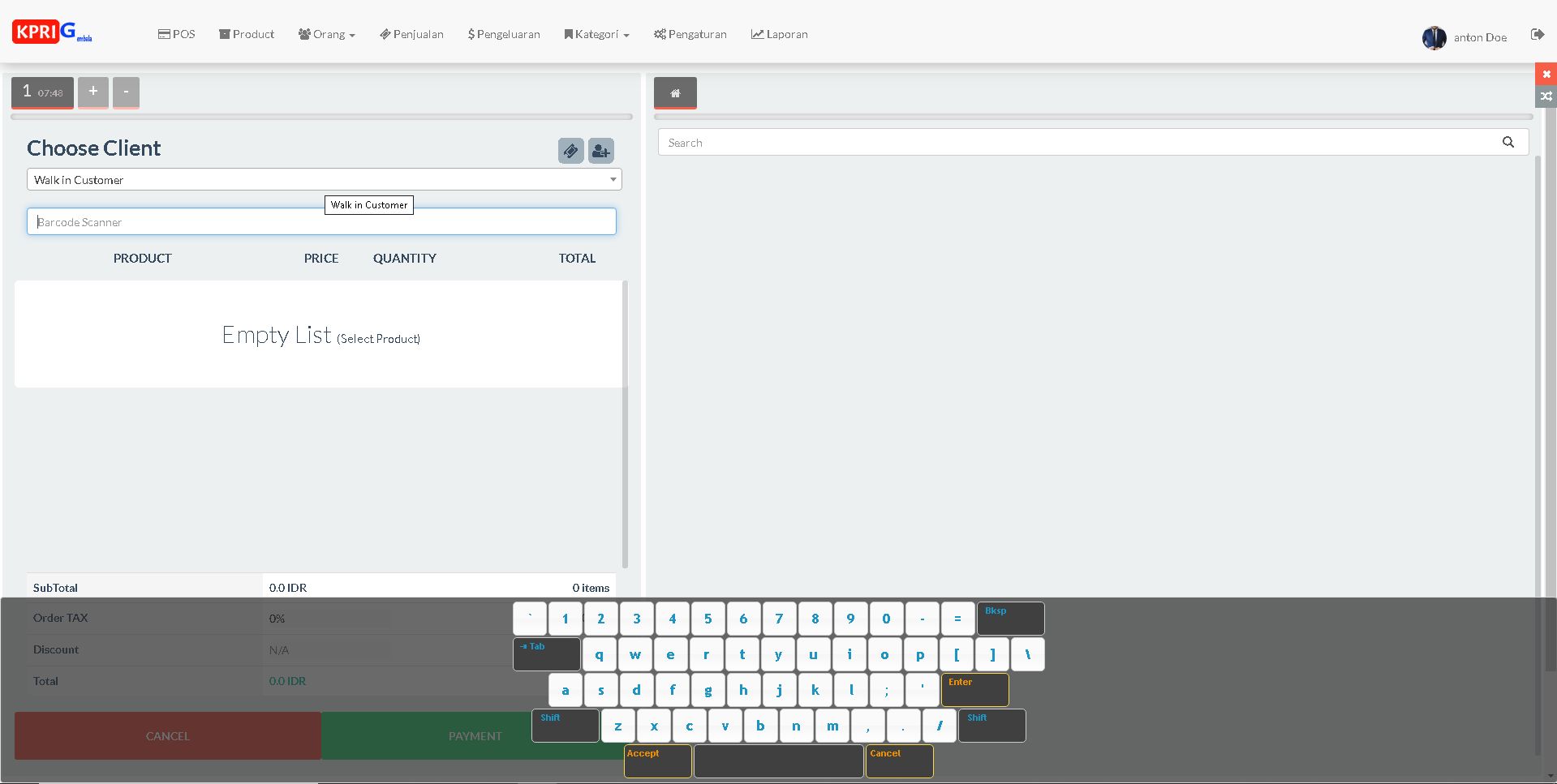 - Halaman POS untuk melakukan penjualan, penjualan sudah support Barcode dan printer